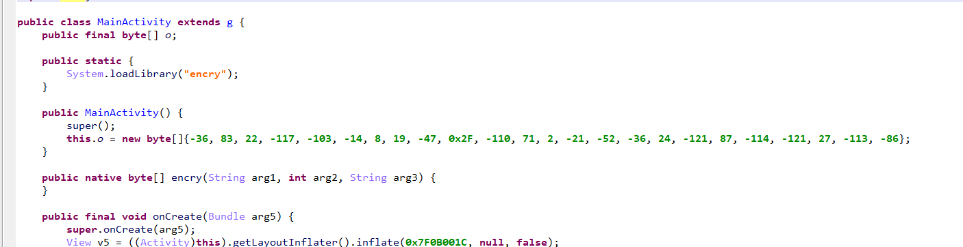 首先找到Activity。这里有疑似最后的加密结果this.o。还有个loadLibrary,那么从Libraries里面取出来libencry.so。